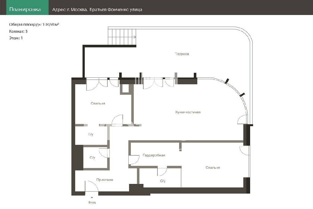 Функциональная планировка включает: 2 спальни и кухню-гостиную, 2 сан. узла и патио