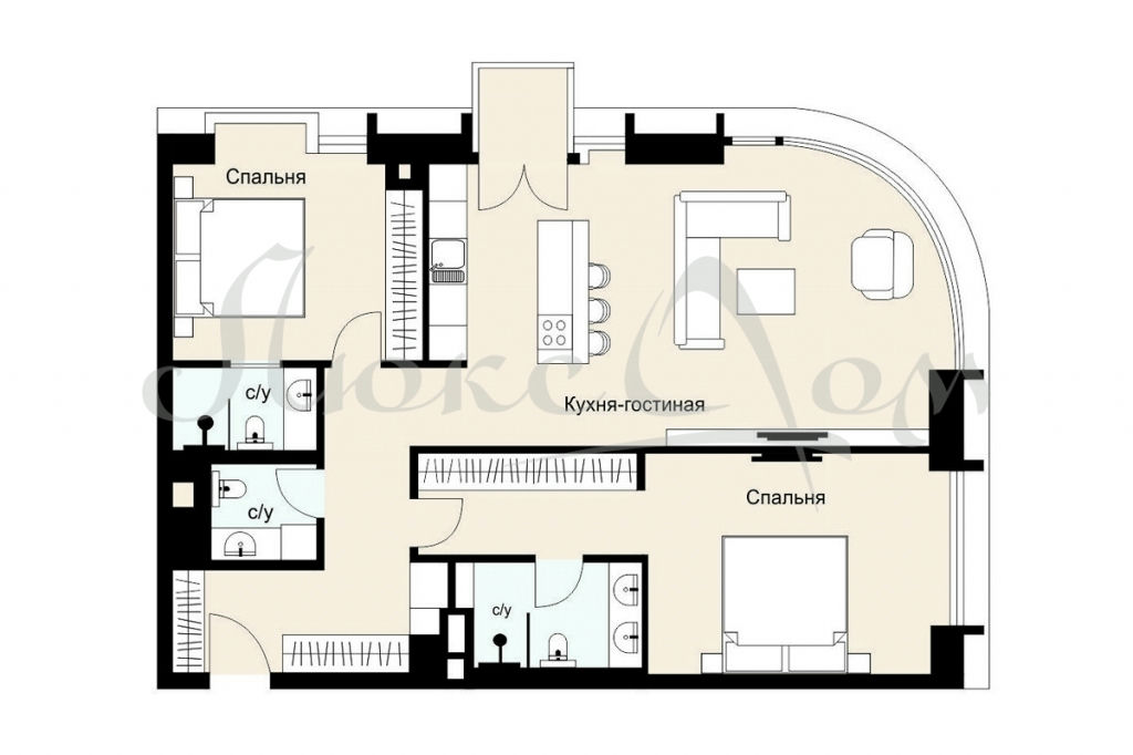 Планировка: кухня-гостиная, 2 спальни с гардеробными и с\у, построчная.