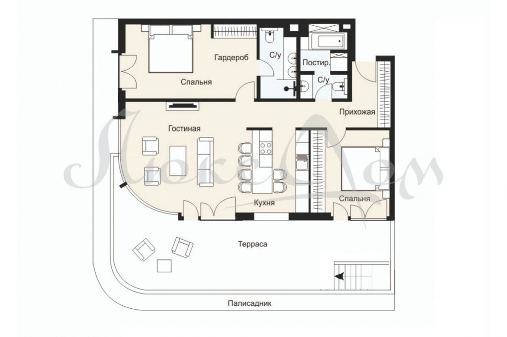 Планировка: кухня-гостиная, 2 спальни с гардеробными и с/у, построчная и терраса 49 м2.