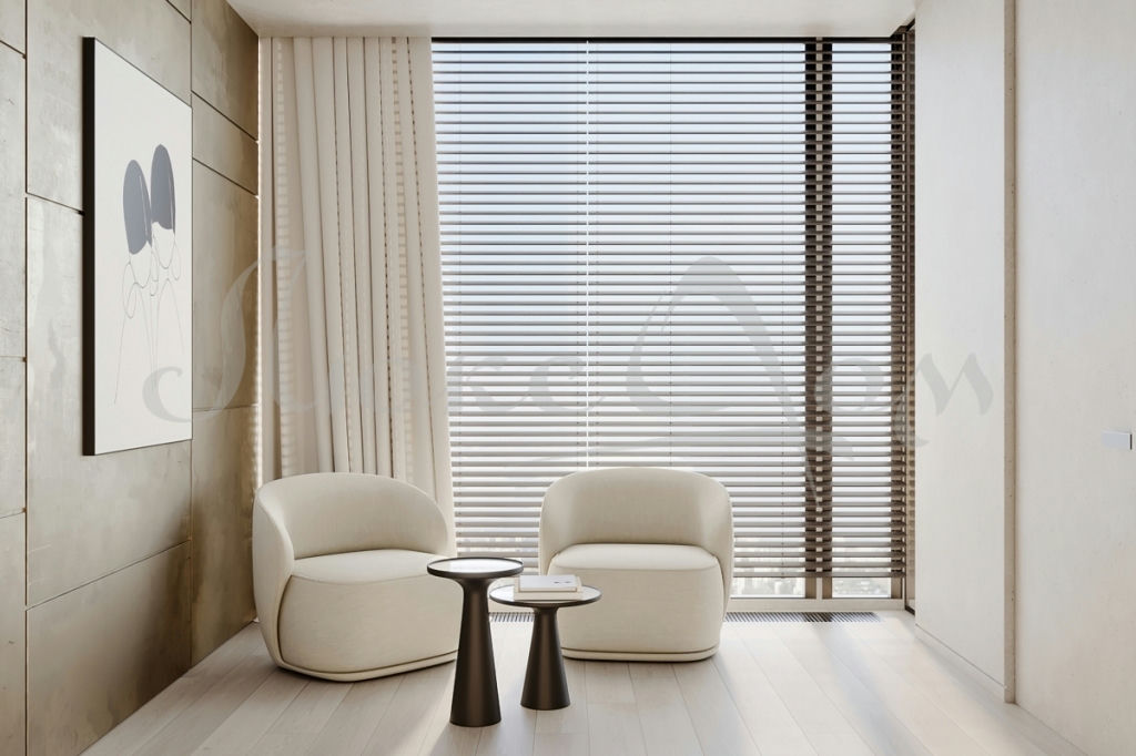 Качественная отделка из натуральных материалов. Панорамные окна в пол.