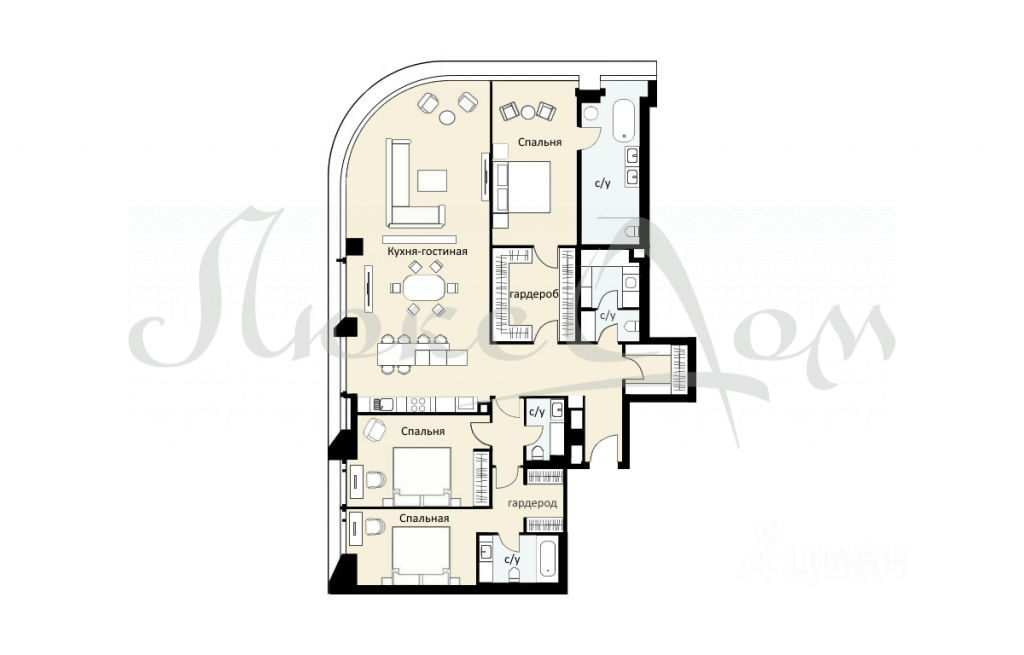 Планировка: кухня-гостиная, 3 мастер спальни с гардеробной и с\у, гостевой с\у.